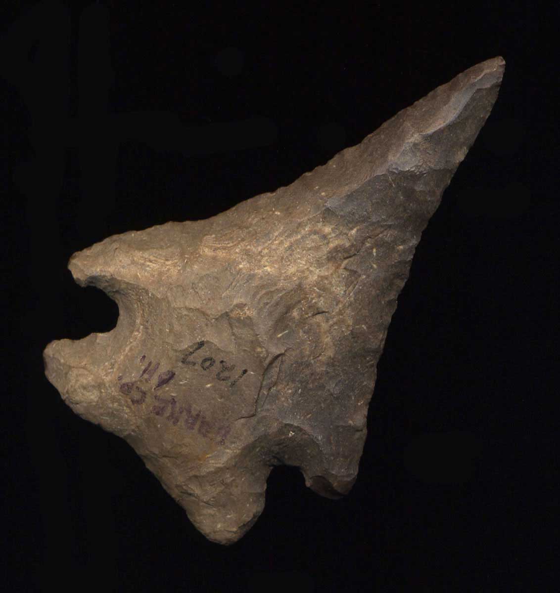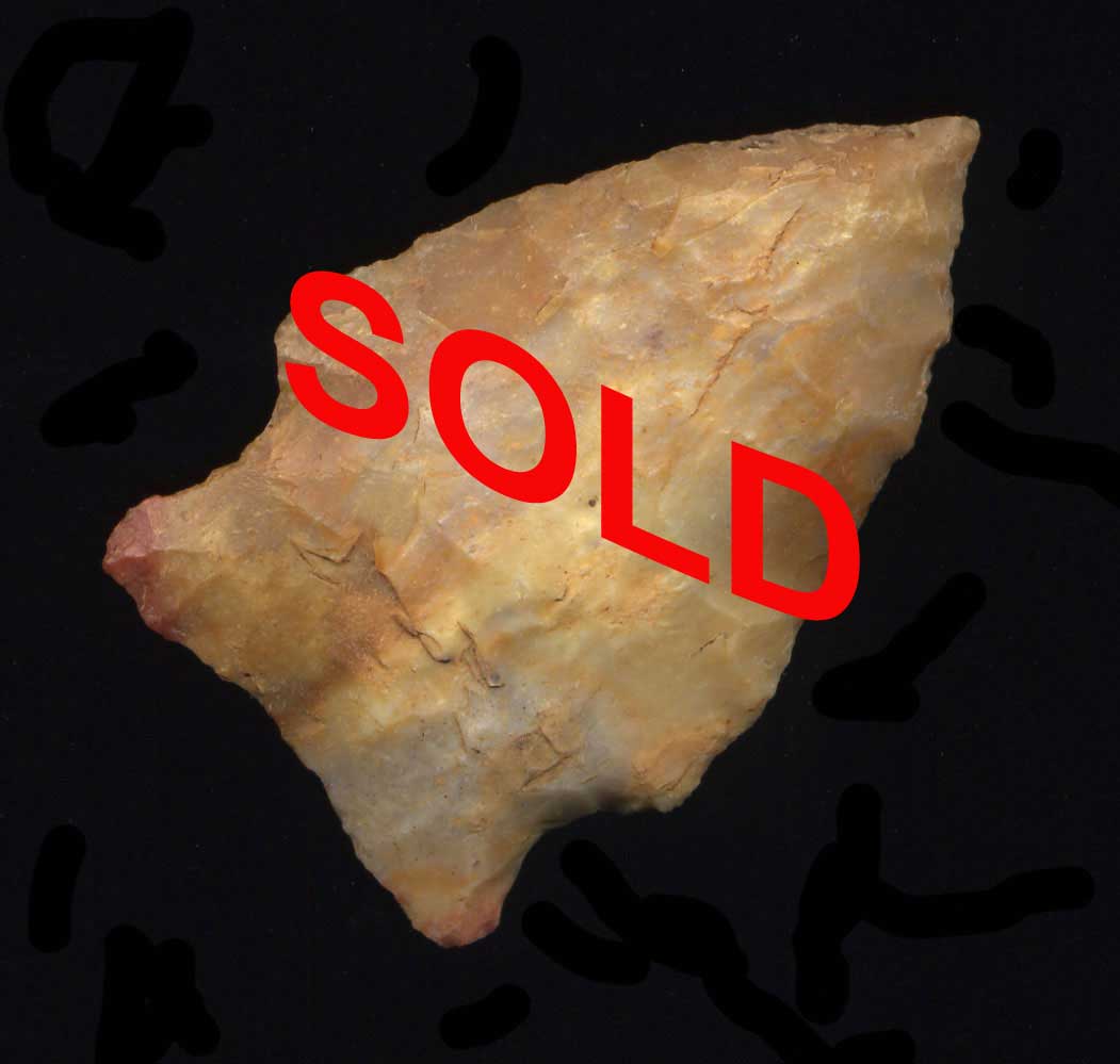 - Description: Early Archaic Corner Notch - This is a beautiful Archaic form. It is made of Carter Cave Chert. It has a needle tip and perfect symmetry. I have not isolated the typology........ it may be a Russell Cave, or a small Stilwell, or a fine Bakers Creek, or something else. It does not really matter, because it is just fine as an Great Archaic Corner Notch. (*note - someone applied a bit of clear fingernail polish to one side that I have not removed. This can be remove with acetone - see photos) It was found in Clark County, KY. Ex- Monty Pennington