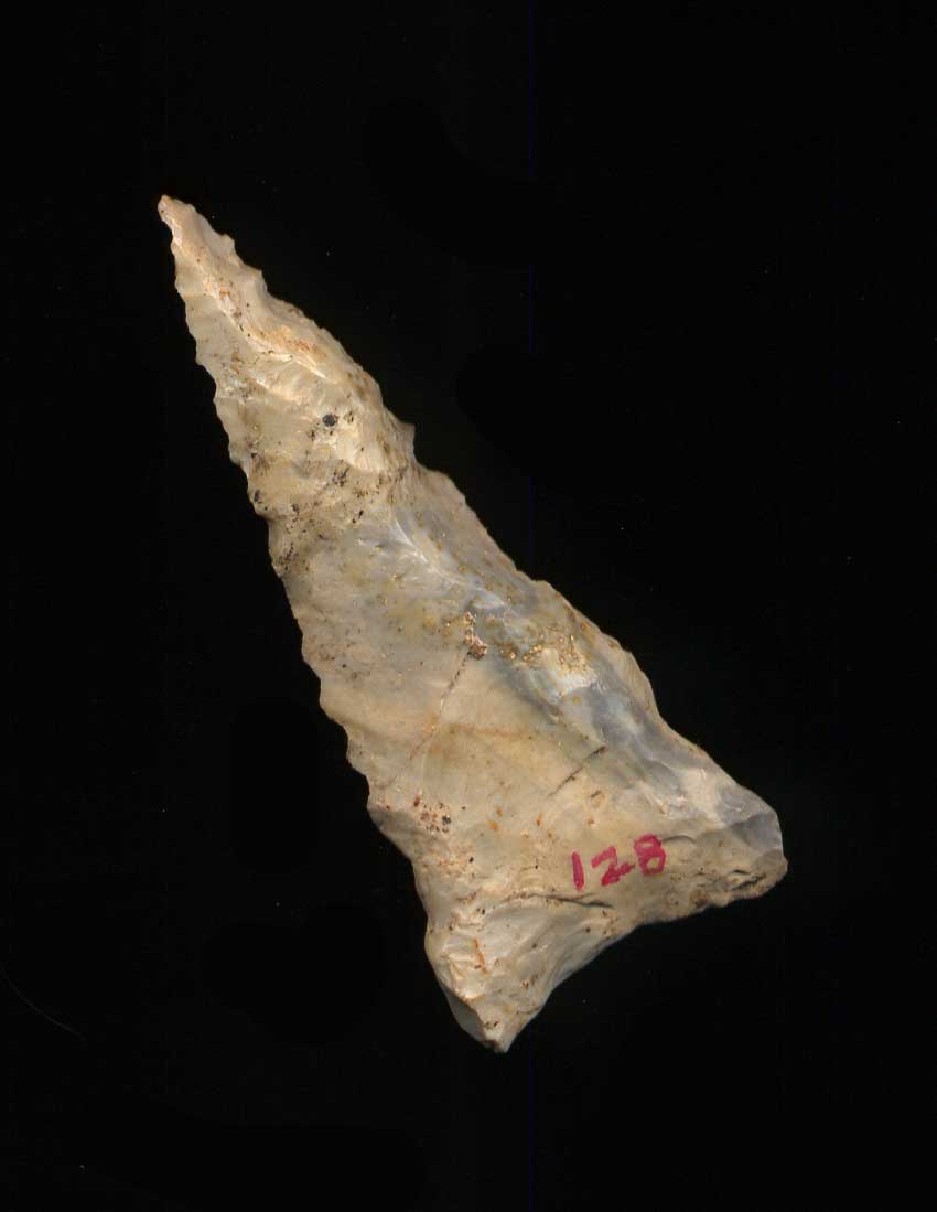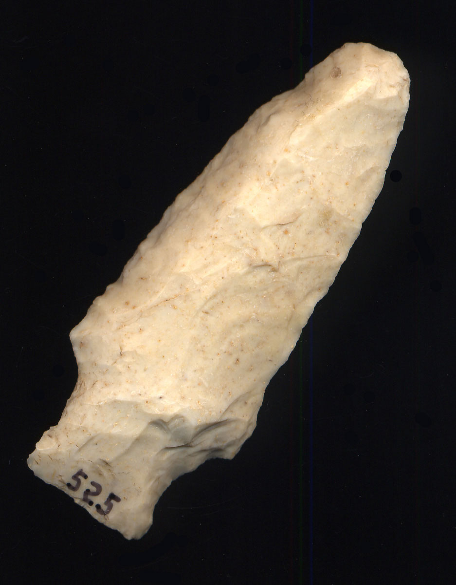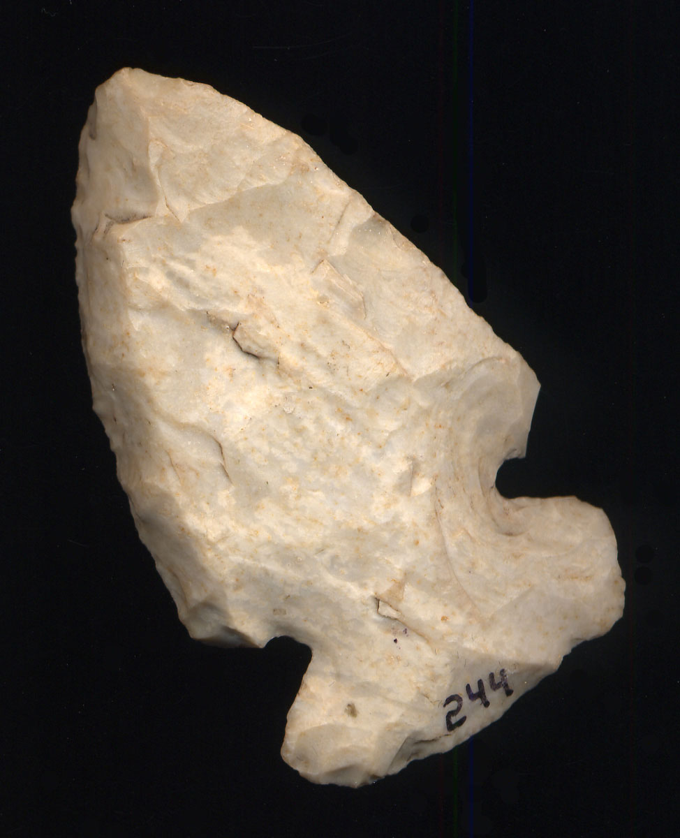 - Description: Colorful Dalton Classic - Here is a Dalton that is right hand beveled and serrated. The basal area is ground. It is made of white and blue Wayne County Chert. Ex- Tom Davis, Ex- Monty & Jewdy Pennington