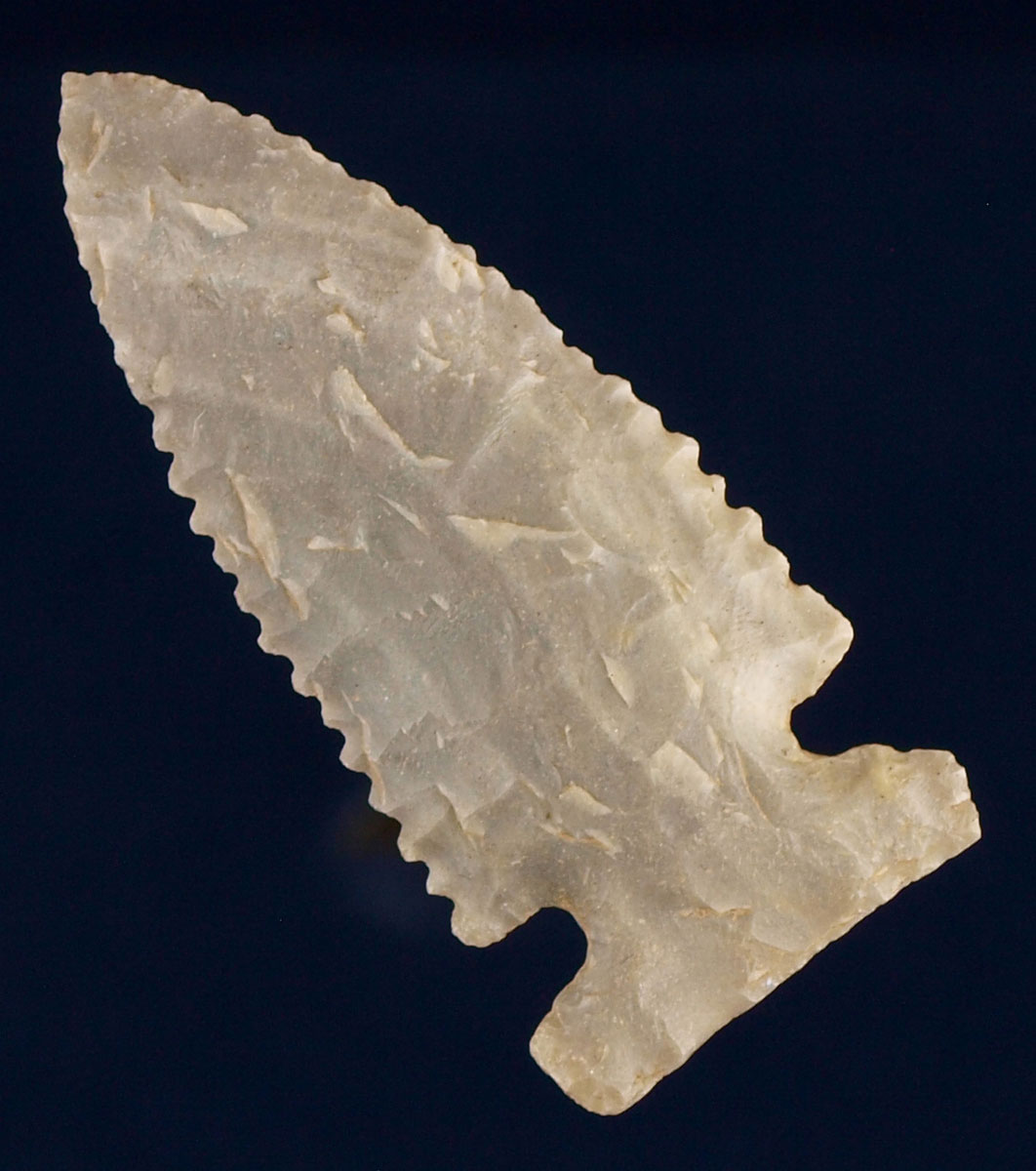 - Description: Highly Translucent E-Notch Big Sandy - Here is a HIGHLY TRANSLUCENT E-Notch Big Sandy made of what I believe to be Pulaski County Chert. It has VERY nice symmetry and shape. The base is nicely ground. This piece was a Personal find of Tony Simpson near a rock shelter off Buck Creek, in Pulaski County, Kentucky in 1993. This type of Big Sandy is rare...... especially when made of such a translucent material. This fine piece is a nice addition to anyone's side-notch collection. This piece is pictured in the NEW Overstreet # 11 on page # 366. Ex- Tony Simpson