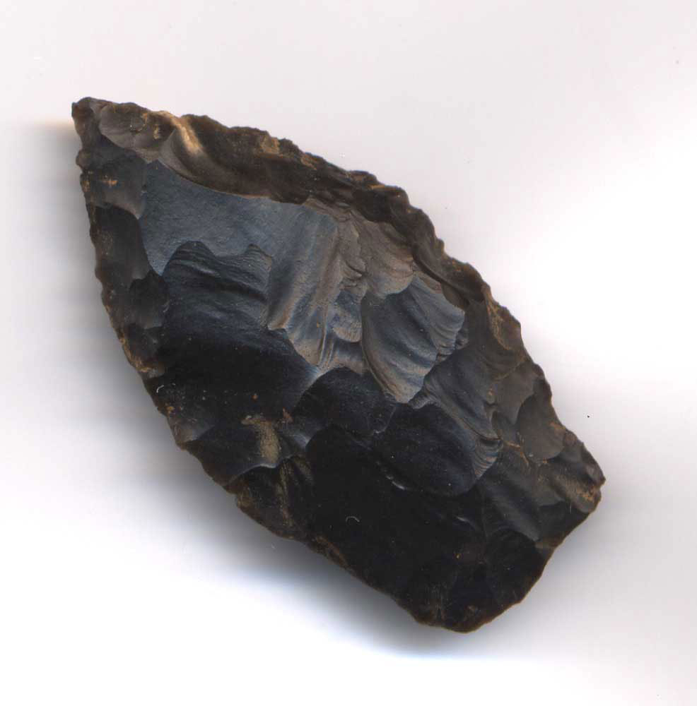 Chert. Nice flaking and great symmetry. This is a sturdy